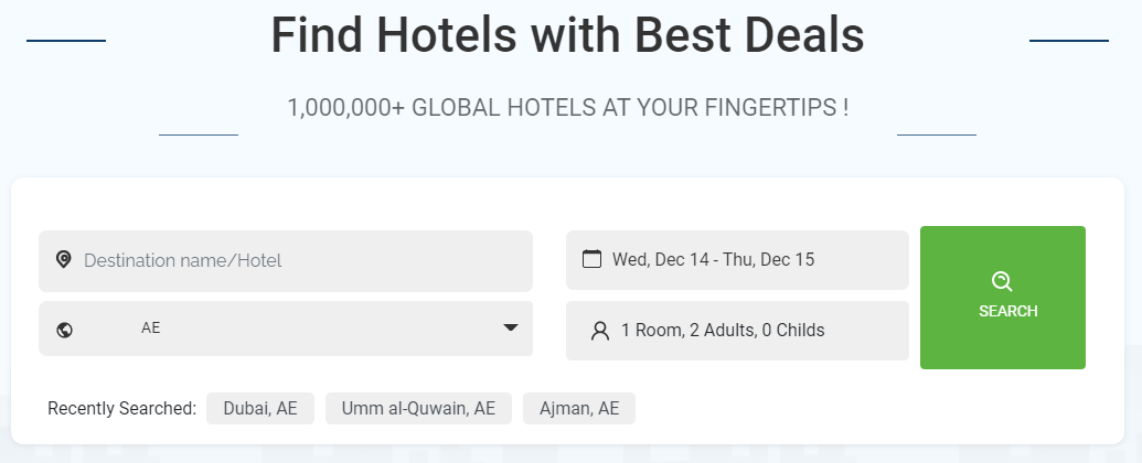 Click on “Hotel” tab. Key in Destination. You will be supported by a drop-down list. Mouse over the list and select. Enter your Check-in and Check-out dates and number of rooms, specifying the number of adults and children, then click on "Search Hotels" tab.